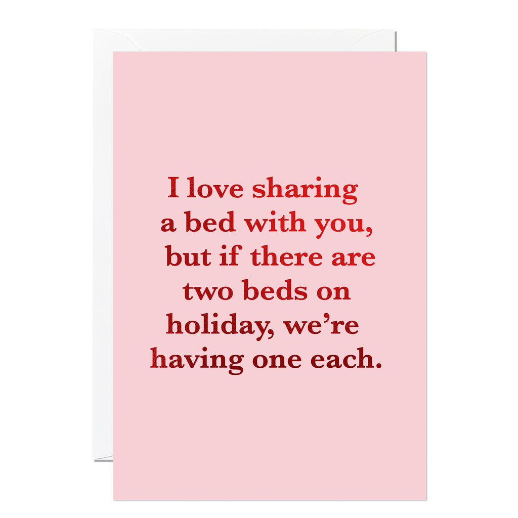 This pink greeting card with bold red foil features the words “I love sharing a bed with you, but if there are two beds on holiday, we’re having one each.” A funny Valentine’s Day card, printed in the UK on 280gsm FSC-certified card stock with a luxury white envelope included.