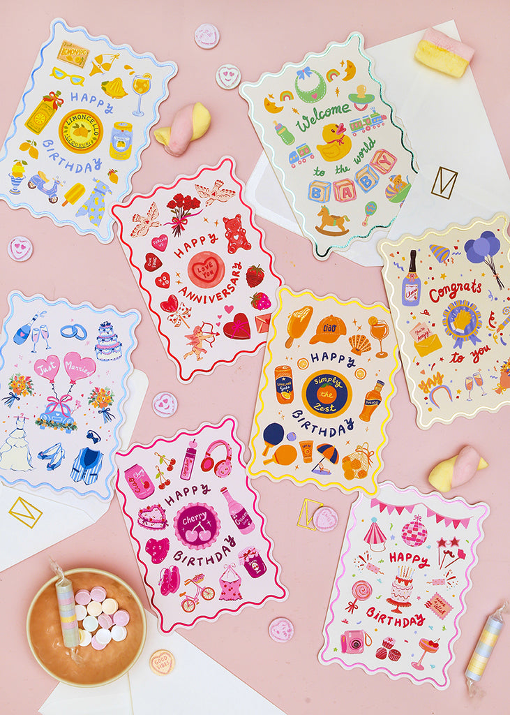 Fresh, fun and full of sunshine, this lemon-themed birthday card is designed to bring a smile the moment it’s seen. Featuring playful illustrations inspired by citrus fruits and summer treats, the design is finished with soft blue hot foil and a decorative die-cut wavy edge for a premium touch. Bold colours and joyful details give this greeting card a lively, modern feel that’s perfect for celebrating birthdays in style. An eye-catching birthday card that stands out on display and feels extra special to give.