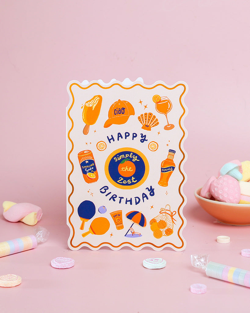 Bring sunshine to their celebration with this vibrant birthday card inspired by citrus fruits, summer drinks and laid-back Mediterranean moments. Finished with shimmering copper hot foil and a distinctive die-cut wavy edge, this greeting card feels playful yet premium. Bold colours and hand-drawn details make it an eye-catching choice for modern birthdays. Perfect for customers who love joyful, design-led stationery, this birthday card looks beautiful on display and feels special to give.