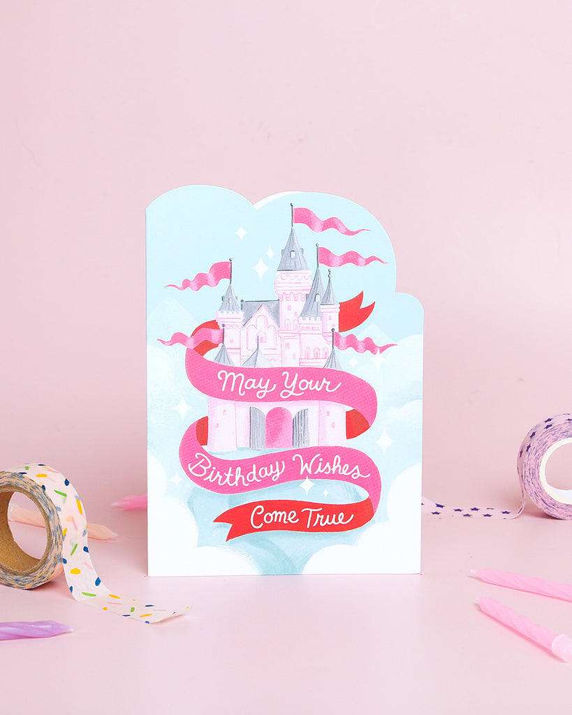 Create a truly magical moment with this fairytale-inspired birthday card, shaped with an elegant die-cut edge. The whimsical castle artwork is hand-painted in gouache, giving the design a soft, painterly texture and a charming storybook feel. Dreamy colours and delicate details make this greeting card a beautiful choice for imaginative birthdays, from children to fairytale-loving adults. A lovely keepsake birthday card that looks just as special on display as it does in hand.