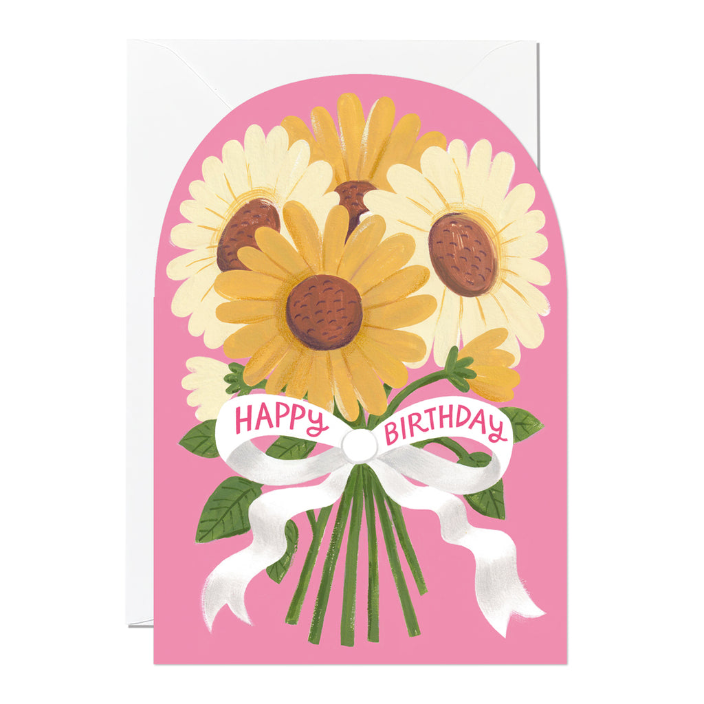 This joyful birthday card features a bright sunflower bouquet, finished in a bold die-cut shape that instantly lifts the design. Hand-painted using traditional gouache paint, the artwork has rich colour, visible brush texture and a warm, uplifting feel. Perfect for sharing sunshine on someone’s birthday, this floral greeting card suits a wide range of recipients and makes a standout display piece as well as a thoughtful keepsake.
